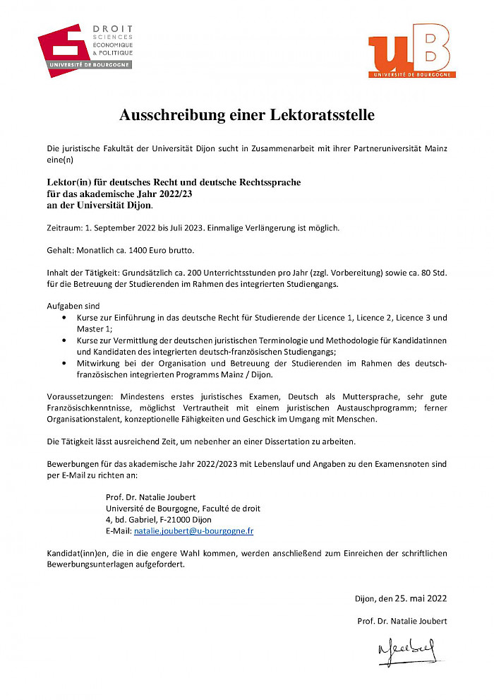 26.05.2022 Ausschreibung einer Stelle als Lektor (in) für deutsches Recht und deutsche Rechtssprache an der Universität Dijon